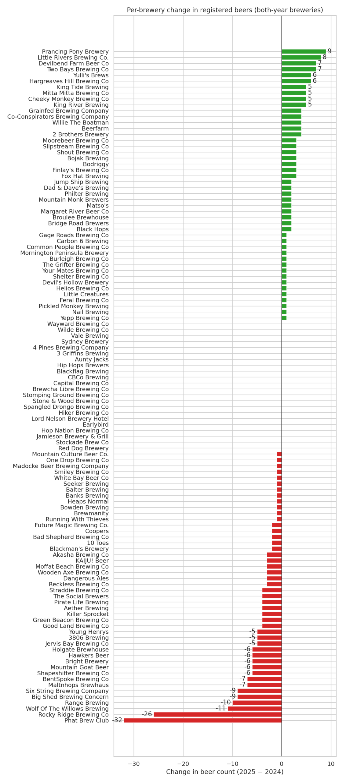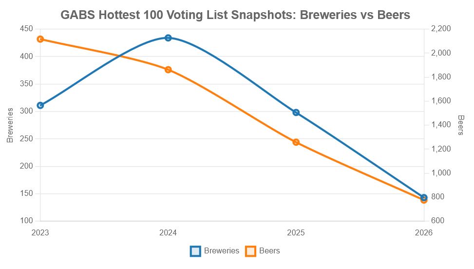 Only 48% of last year’s breweries have returned to contest the H100. Among the 155 breweries that were present last year but absent this year, some are unsurprising. Operations like Fox Friday and Dainton haven’t returned for obvious reasons. But there are also some notable omissions. Ballistic, Otherside, Brick Lane, Heads of Noosa, Little Bang, Revel, Fixation, Moon Dog, and even James Squires have not entered beers for the 2025 H100. Performance varies by brewery, but all have polled beers in the H100 in years past.