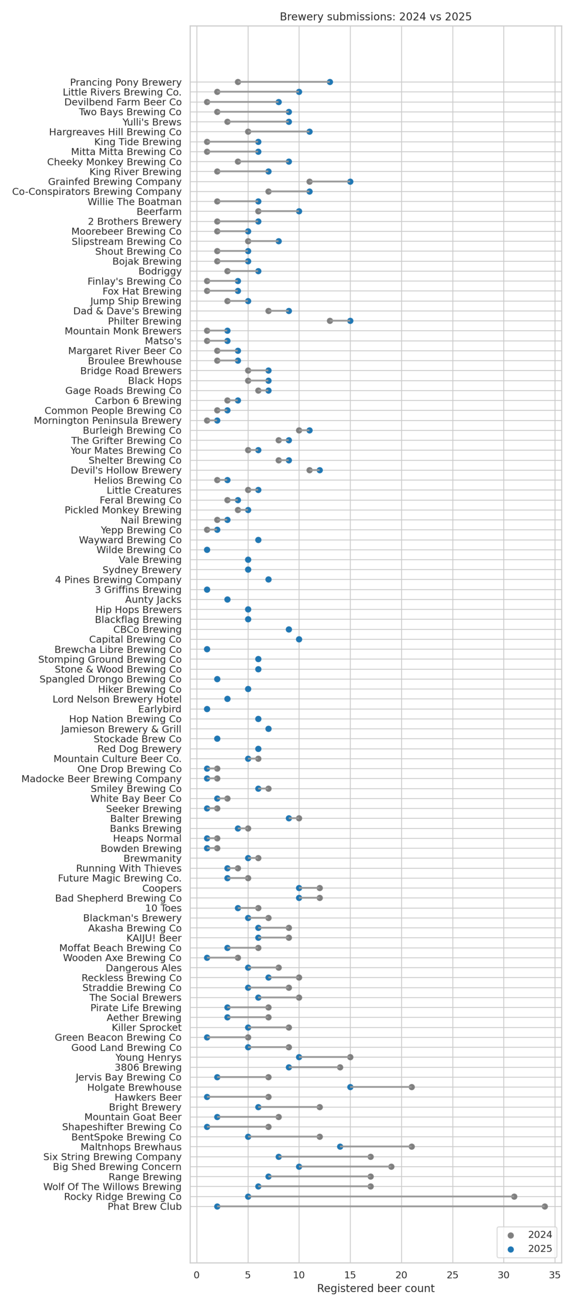 This seems consistent with the behaviour of some breweries (for example, Rocky Ridge and Phat Brew Club) who appear to have trimmed their entries considerably compared to previous years.